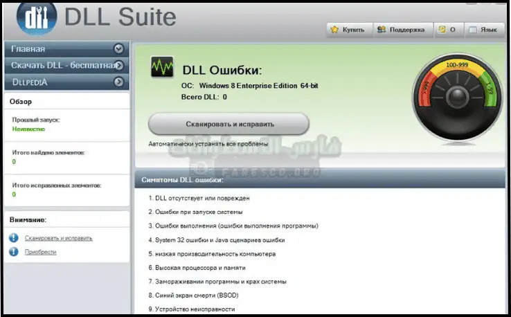 يُمكنه إصلاح أنواع مُختلفة من الأخطاء المُتعلقة بملفات DLL: ملفات DLL مفقودة، وأخرى تالفة، بالإضافة إلى مشاكل النظام المُتعلقة بها (يُزعم أنه يُساعد في حل أخطاء الشاشة الزرقاء من خلال حل مشاكل DLL الأساسية).