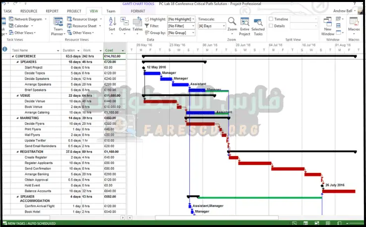 - أضف المهام والموارد وقم بتحديد العلاقات بين المهام.