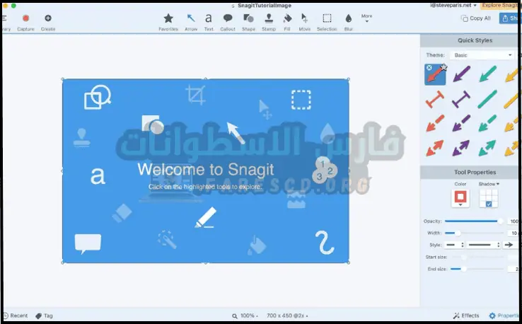 برنامج سناجيت Snagit للكمبيوتر هو برنامج تصوير سطح المكتب فيديو وصور كامل Techsmith Snagit هو برنامج تصوير الشاشة وسطح المكتب من إنتاج شركة Techsmith والتي قدمنا لها برنامج Camtasia Studio المتخصص في تسجيل شاشة الكمبيوتر كفيديو وإنشاء شروحات حصرية ومشاركتها على اليوتيوب والفيس بوك وغيرها من المواقع بجودة عالية.